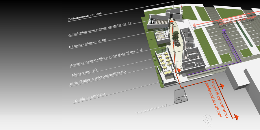 Caposaldo che si pone a fondamento del progetto è che la vicina area a verde attrezzato dovesse mantenere un ruolo sostanziale anche dopo l’intervento di realizzazione della nuova scuola (dalla quale dovrebbe semmai trarre valorizzazione). Tutto questo è qui restituito mediante l’intuizione, perseguita e raggiunta con la realizzazione di sfondati architettonici e di una fruizione del parco senza soluzione di continuità. Un continuo incrociarsi di percorsi secondo variabili linee conduttrici che dal verde circostante hanno origine, intersecandosi in corrispondenza dell’albero collocato nell’atrio distributivo al piano terra che assurge, pertanto, al ruolo di fulcro baricentrico dell’intero progetto, ponendosi sull’incrocio delle diagonali e delle direttrici nel centro nevralgico di vivibilità del nuovo edificio scolastico.