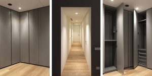 Eleganza, modernità e geometrie. La ristrutturazione dell’appartamento ha previsto una nuova distribuzione degli spazi interni e si contraddistingue per i contrasti, i grandi spazi ariosi e il legno, protagonista di pavimentazioni e arredi. Sin dall’ingresso si viene accolti in uno spazio completamente rivestito dove sono stati nascosti gli accessi alla zona ripostiglio e alla zona lavanderia.